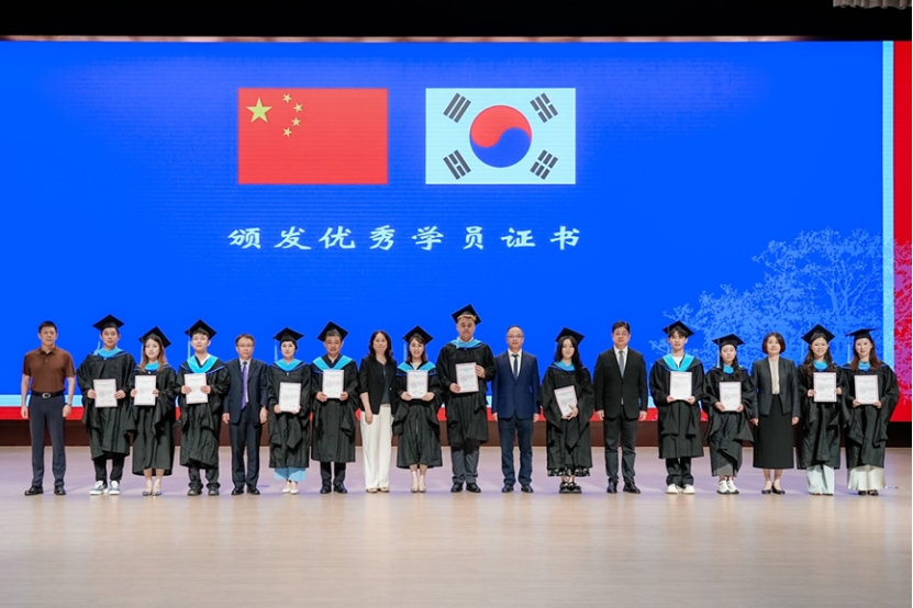 杨薇作本届中韩合作办学项目硕士研究生培养过程报告。中韩双方相关部门负责人向双方教学和管理人员、优秀学员等颁发优秀论文证书和优秀学员证书。