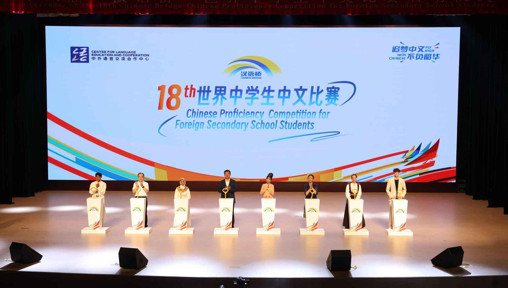 开幕式上,30名天津青少年以清脆嘹亮的歌声真情演唱了《我在天津等你》。优美的旋律勾勒出天津的四季景致与地域文化符号,满腔热忱欢迎世界各地青少年的到来。节目《字脉千年》通过人机组合联动,将传统舞蹈与律动欢快的查尔斯顿舞巧妙结合,呈现出传统与现代的美妙融合,象征着中华文化在数智时代跨越疆界,促进语言互通、理解互信、文明互鉴的美好愿景。开幕式现场,嘉宾同五大洲选手代表共同上台手持开启未来的“金钥匙”,一同开启语通未来的“文化之门”,第十八届“汉语桥”世界中学生中文比赛正式拉开序幕。