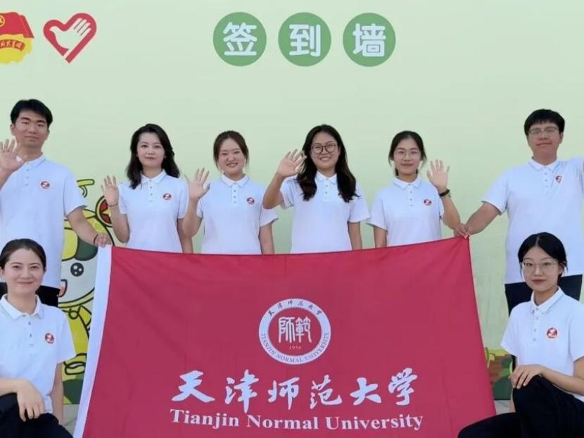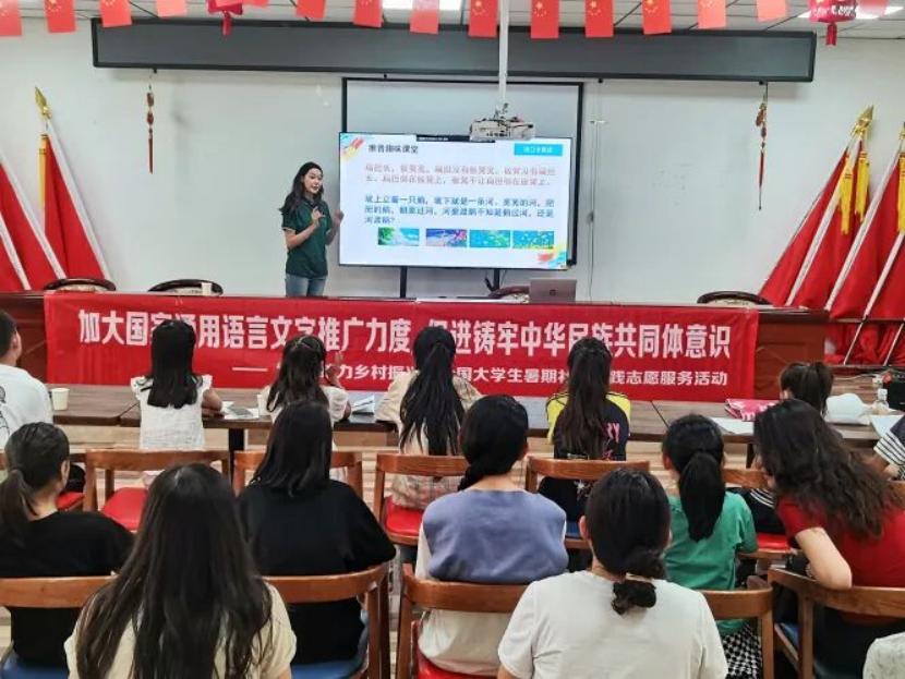 使命践行:构筑民族同心桥为积极响应共青团中央关于“三下乡”社会实践的号召,发挥青年力量助力乡村振兴,研支团全员参与2025年“三下乡”暑期社会实践活动,组建的“津师普语西行,数字推普兴乡”志愿服务团队入选全国重点团队。他们前往新疆、甘肃、重庆三地的4个社区以及甘肃省博物馆,开展形式多样的普通话推广活动。在甘肃省博物馆里,成员们在文物鉴赏中触摸文明根脉,在红色研学中汲取精神力量,以普通话为载体,让历史“诉说”与革命的“故事”;在社区里,成员们将方言与普通话相对照,用小故事引出“学好说好普通话”的大道理,增添绕口令、“我是小小讲解员”等趣味推普课堂,同时辅以数字语博体验等多元活动,形成一堂堂“推普”思政课,在推广普及国家通用语言文字的过程中帮助孩子们铸牢中华民族共同体意识。